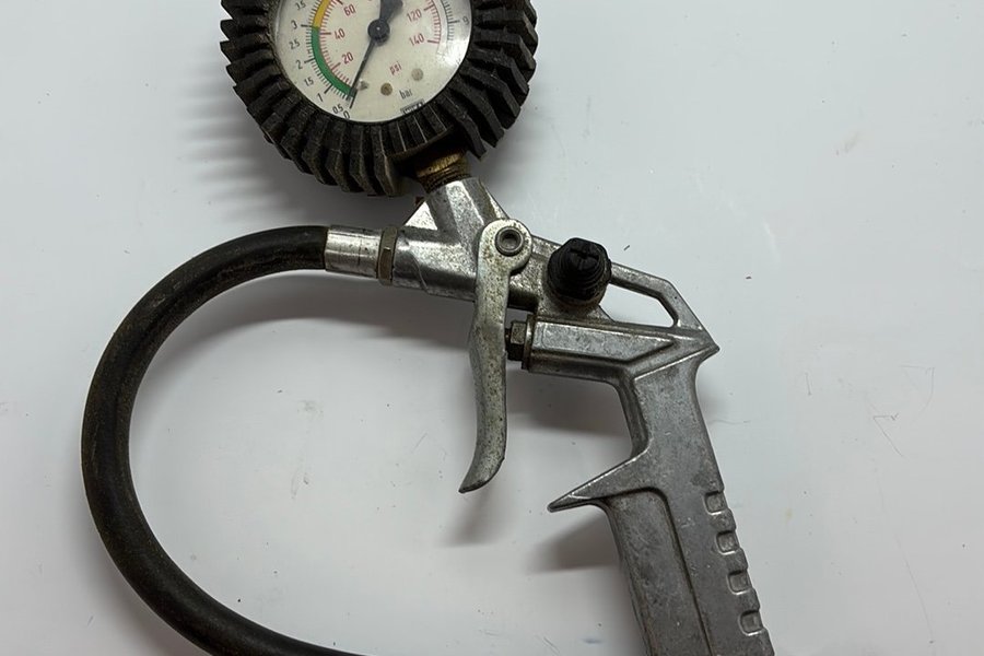 Däcktrycksmätare med pistolgrepp och slang. Mätaren visar tryck i både PSI och Bar.