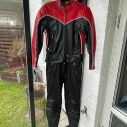 Säker min pappas gamla Mc-ställ, det är i två delar i storlek 54. Jackan och byxorna kan kopplas ihop. Jackan har en dragkedja framtill och byxorna har en knapp och dragkedja. Både jackan och byxorna har fickor med dragkedja. Jackan har även en justerbar midja med knappar samt förstärkning i ryggen.