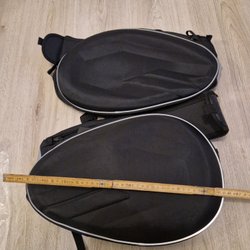 Ett par hårda svarta väskor med svart skinn på locken, går att ta av, sitter med kardborreband. 1st nyckel finns. Fästen som ska sitta på cykeln följer också med. Väldigt fina! Satt monterade på en Roadking -07a, men passar nog dom flesta hd touring modellerna.