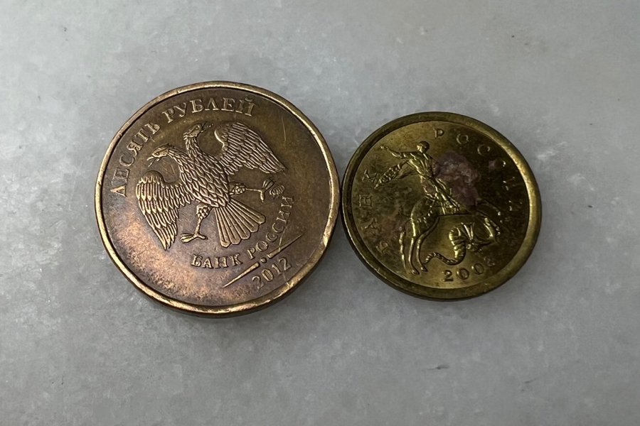 Två ryska mynt. Det ena myntet är från 2012 och har värdet tio rubel. Det andra myntet är från 2008.