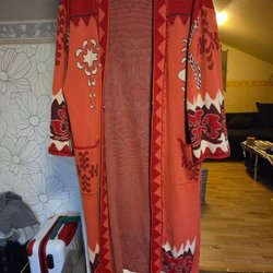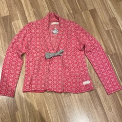 Stickad kofta med ett mönster i nyanser av vitt och blått. Den har en knytning i midjan med ett mörkblått band.