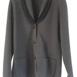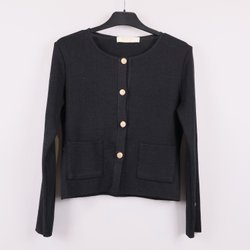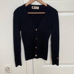 En stickad kofta med v-ringning och tre knappar. Koftan har en ribbadstruktur och långa ärmar.