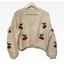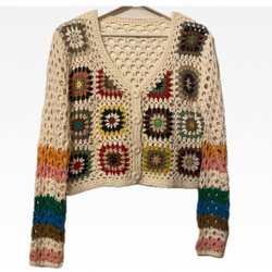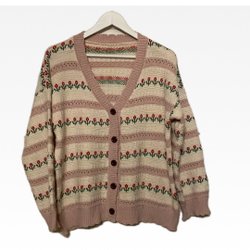 Färgglad stickad kofta med V-ringning och knappar framtill. Koftan har ett mönster med olika färger och former, inklusive stiliserade djurmotiv. Den har ribbade muddar och nederkant. Material är i 100% akryl.