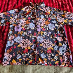 Vacker stickad kofta med traditionellt norskt mönster. Den har dekorativa detaljer längs framsidan och ärmsluten, samt unika metallspännen som knäppning. Koftan har en rund halsringning och ett intrikat stickat mönster över hela plagget.