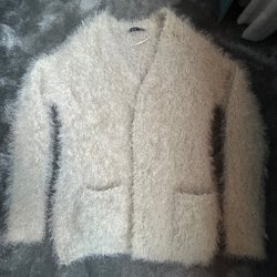 Vit, stickad kofta med krage och tre knappar. Koftan har ett kabelstickat mönster framtill och två fickor nästan helt ny.