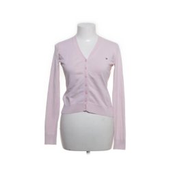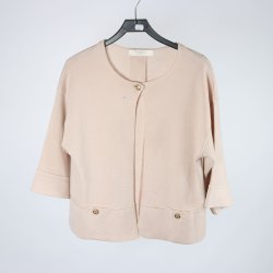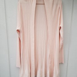 Ljusrosa, stickad kofta med trekvartsärm. Koftan är öppen framtill och har ett luftigt, genombrutet mönster.