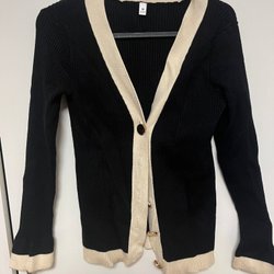 Svart, fluffig kofta med V-ringning och långa ärmar. Tröjan har en avslappnad passform och 1 hyske som man knäpper. Strl L men passar en som har strl M också. Tror den är köpt på kappahl för många år sen. Sparsamt använd