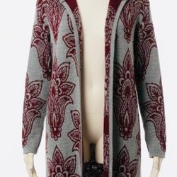 Gråmelerad kofta med ett svart rutmönster. Koftan har en öppen design utan knäppning.