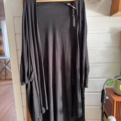 Lång, svart kofta med fickor fram. Koftan har en grovstickad struktur och en öppen design utan knäppning.