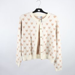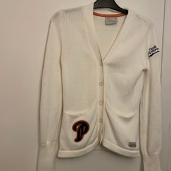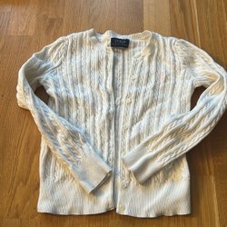Vit, stickad kofta med krage och tre knappar. Koftan har ett kabelstickat mönster framtill och två fickor nästan helt ny.