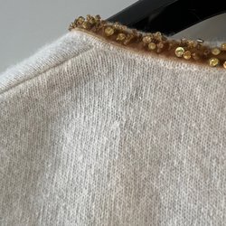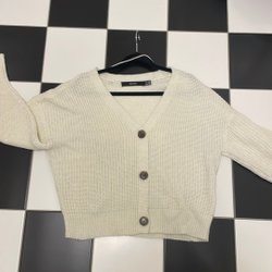 Vit, stickad kofta med krage och tre knappar. Koftan har ett kabelstickat mönster framtill och två fickor nästan helt ny.