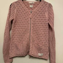 Långärmad kofta i en rosa nyans med ett knytband i midjan. Ärmsluten är dekorerade med fuskpäls och pärlor.