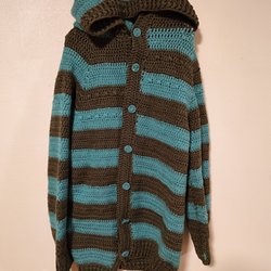 Blå stickad kofta med v-ringning och knäppning framtill. Koftan har ett fint hålmönster.