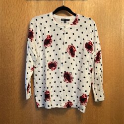 Vit kofta med långa ärmar och knäppning framtill. Koftan har en strukturerad yta och en peplum-liknande nederkant som ger en feminin silhuett. Den är öppen framtill med knappar.