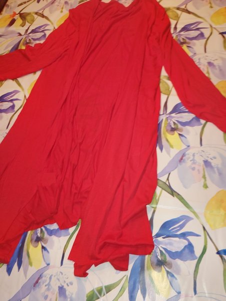 Röd långärmad kofta. Perfekt att bära över en klänning eller en topp.