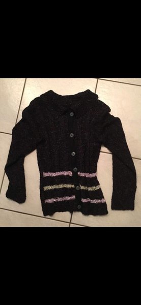 Svart stickad kofta med lång ärm och krage. Den har knappar fram och dekorativa ränder i rosa och guld.