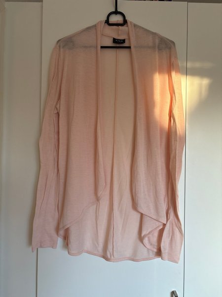 Långärmad kofta i en ljusrosa nyans. Koftan har en öppen design utan knäppning och faller mjukt. Ärmarna är långa. Nederkanten är rundad och har en fin finish.