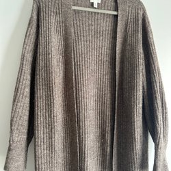 Brunfärgad kofta med knappar framtill och en bred krage. Koftan har en ribbad struktur och en asymmetrisk design.