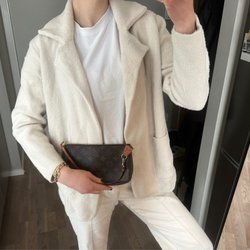 Vit kofta med pärlemorknappar framtill. Koftan har långa ärmar och en rundad halsringning. Passar bra att bära över en klänning eller topp.