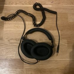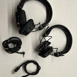Marshall hörlurar i svart färg. Dessa hörlurar är av over-ear-modell och har en anslutningskabel med 3,5 mm-kontakt.