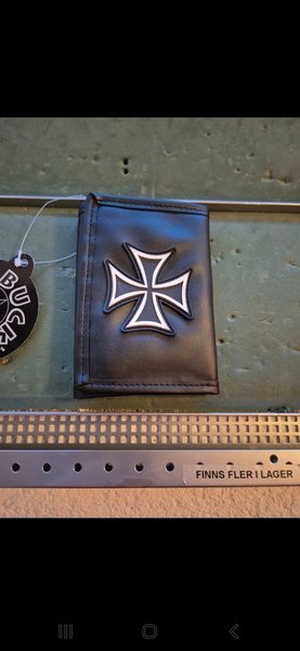 Svart plånbok med ett järnkors på framsidan. Plånboken är en tri-fold modell.