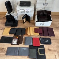 Ett parti med plånböcker i olika utföranden. Vissa har plats för kontokort och sedlar, andra har en sedelklämma. Några av plånböckerna har texten ”Malmö Arena” tryckt på framsidan.20.st.