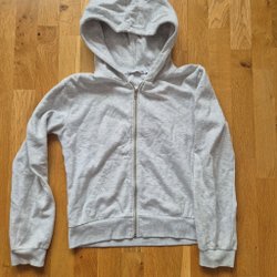 Grå luvtröja med hel dragkedja framtill och vita dragskor. På vänster bröst finns ett tryck med texten "Val T'sere" och "France" med en liten fransk flagga i mitten. I storlek XL.