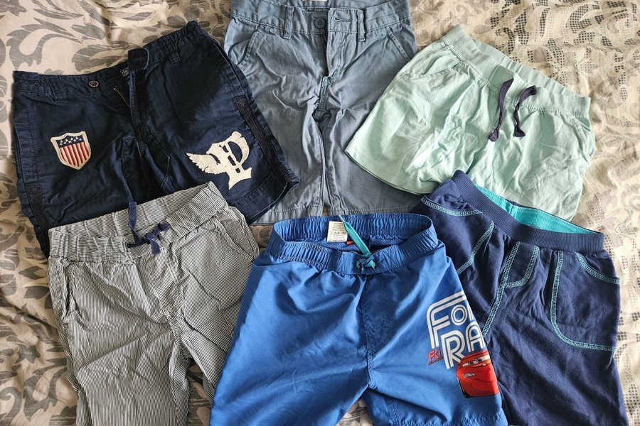 Ett set med sex par shorts för barn. Inkluderar ett par ljusblå Levi's shorts, ett par marinblå shorts med en amerikansk flagga och en vit vinge, ett par randiga shorts, ett par turkosa shorts, ett par blå shorts med Cars tryck och ett par mörkblå shorts med ljusblå detaljer.
