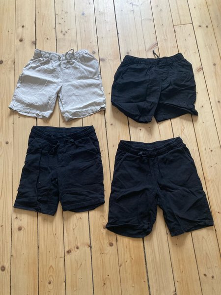 Fyra par shorts. Ett par är ljusgrå och tre par är svarta. Alla shorts har resår i midjan och dragsko. De två övre shortsen är av linne och de andra i bomull. Katt finns i rökfritt hem, har tvättats parfymfritt. Strl 146-152, inte stora i strl.