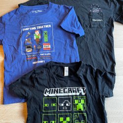 3 stycken T-shirts med tryck som knappt är använda. Jag upplever att alla 3 är ungefär lika stora men den blå med apor och den mörkgrå i mitten är i storlek 152/158 och den gröna är i storlek 146/152. Tröjorna är köpta utomlands på två stora butikskedjor (LC Waikiki och Defacto). De är knappt använda då de ej föll sonen i smaken.