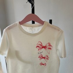 Vit t-shirt med korta ärmar. Den har ett tryck av ordet "Grandeur" på bröstet och svarta ränder på ärmarna. En liten svart etikett finns nedtill på framsidan.