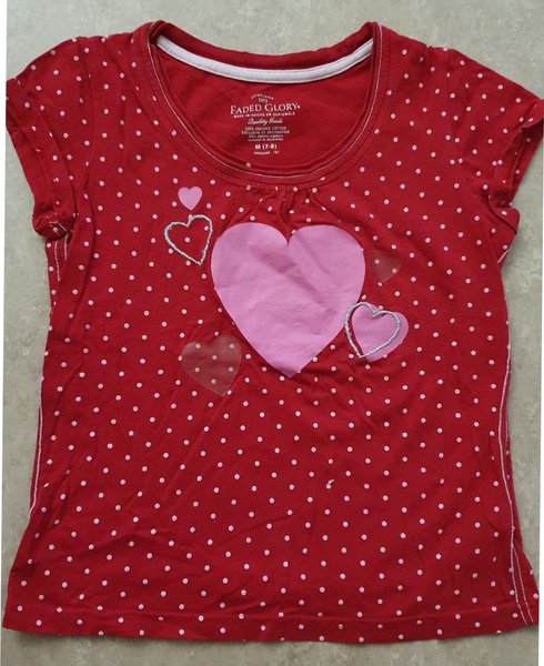 Röd t-shirt med korta ärmar och ett mönster av små vita prickar över hela plagget. Framtill finns flera hjärtapplikationer i olika storlekar och nyanser av rosa, samt ett hjärta med silverfärgad brodyr. Halsringningen är rund med en vit kant.