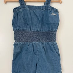 Söt jeansoverall med knappar framtill och volangdetaljer på axlarna. Overallen har resårband vid bensluten.