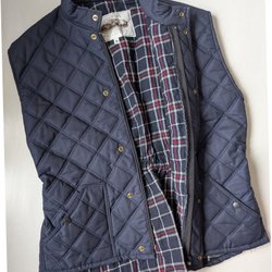 Mörkblå väst med dragkedja framtill och fickor med dragkedja på sidorna. Något större än M