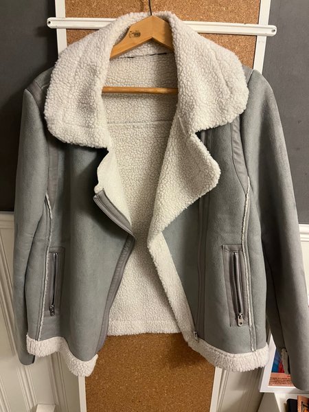 Grå jacka med dragkedja och detaljer i konstläder. Jackan har en vit teddyfodring som syns vid kragen och nederkanten. Fickor med dragkedja finns på båda sidor.