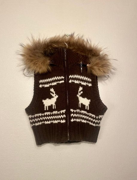 Brun stickad väst med dragkedja och luva med fuskpäls. Västen har ett mönster med vita ränder och renar. Unna dig själv jul