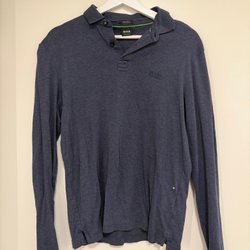 Grå långärmad pikétröja med en broderad logotyp på bröstet. Tröjan har en klassisk krage och en knappslå med tre knappar.