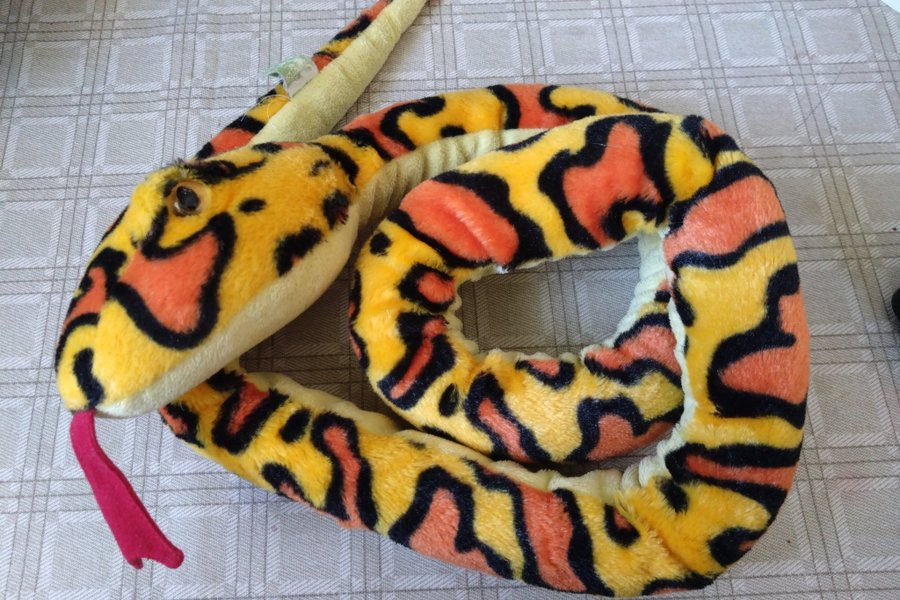 Mjukisorm i gult, orange och svart. Ca 165 cm lång, fint skick.