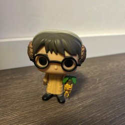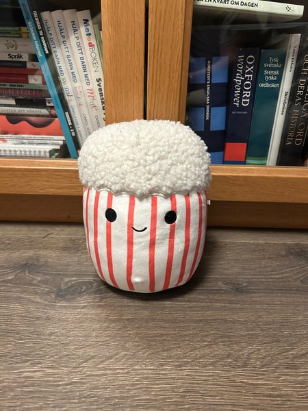 Gosedjur format som en popcornbägare med popcorn. Gosedjuret har ett glatt ansikte.