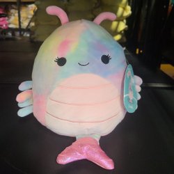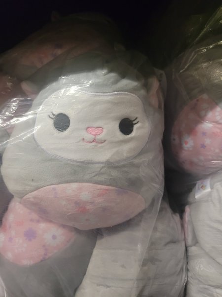 Squishmallows gosedjur i form av ett grått lamm med rosa och lila blomdetaljer på magen. Gosedjuret är förpackat i plast.