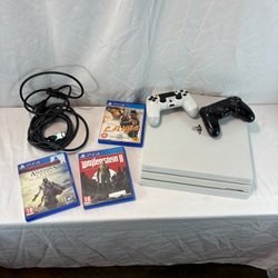 Playstation 4 med 3 handkontroller och kablar. (En av kontrollerna har lite skadad l2 knapp men inget som påverkar). Laddare till kontroller ingår.