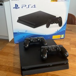 Playstation 4 slim 500GB jubileumsutgåva. Två matchande dualshock handkontroller och ett original Sony PlayStation headset Medföljer. Ej chippad/flashad. Fabriksåterställd med senaste mjukvaran.