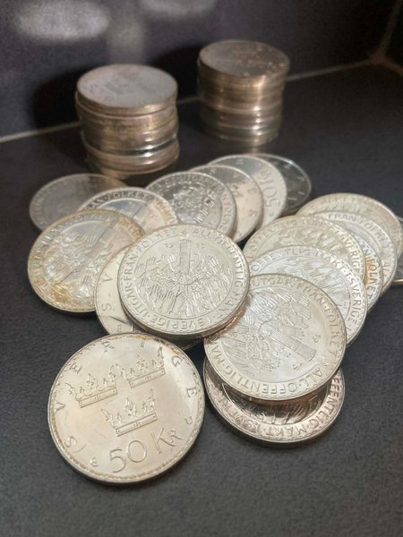 40st Silvermynt med valören 50 kr. Årtal 1975. Varje mynt väger 27g varav 25g är silver. Totalt säljes alltså 1kg silvervikt.