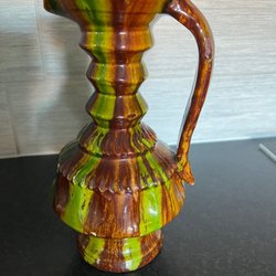 Mycke fint dekorativ keramikkanna med två pipar och ett handtag. Kannan är dekorerad med blommor och en fågel.