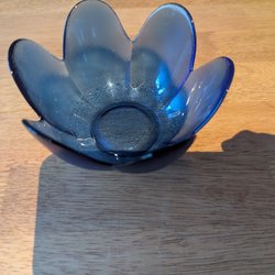 En blå skål. 15cm i diameter och 8cm hög. Passar även som ljushållare till kubbljus.