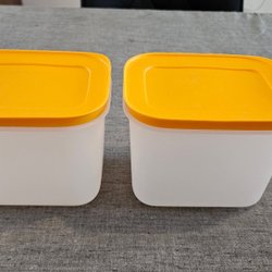 En Tupperware burk med ett gult lock. Burken är vit och locket är gult. Burken är ca 10 cm hög.