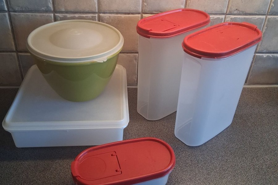 Set med Tupperware-produkter. Innehåller en grön skål med lock, en rektangulär behållare med lock och två höga, ovala behållare med röda lock.