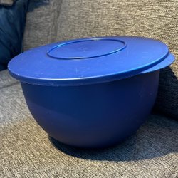 En blå Tupperware tillbringare med lock.