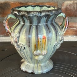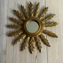 Väggspegel med motiv av en sol och en måne. Solen har en spegel i mitten och månen är detaljerad med ansiktsdrag. Spegeln har en färgstark design med röda och gula nyanser samt dekorativa detaljer i guld och små silverspeglar . Baksidan är försedd med en upphängningsanordning.L30cm H.24 cm skick har lossnat lite gulddetaljer o små speglar annars i gott skick !