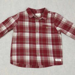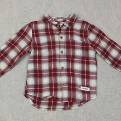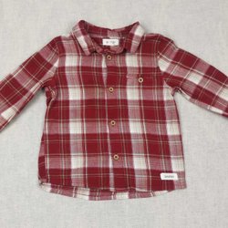 Säljer en långärmad skjorta som är röd och beige i färgerna.